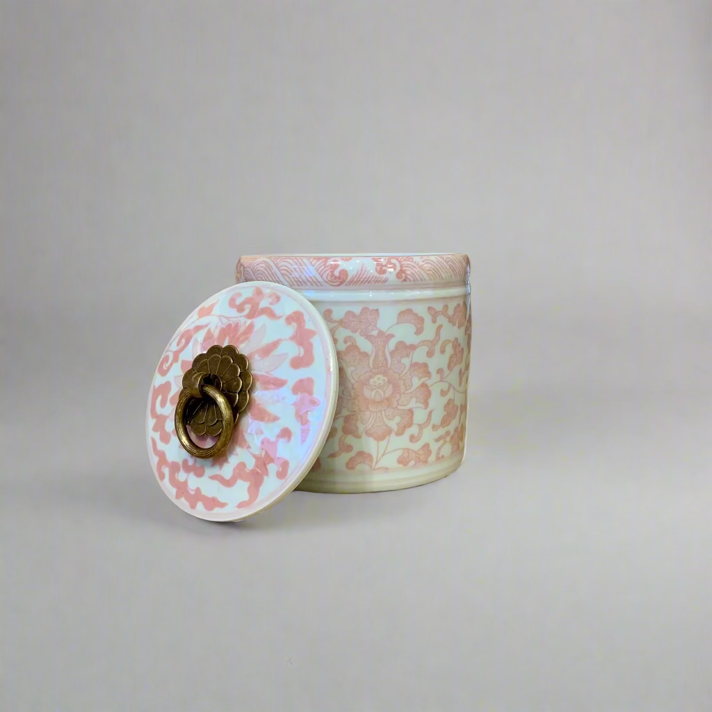 Pink & White Ceramic Storage Jar - Brass Ring Handle