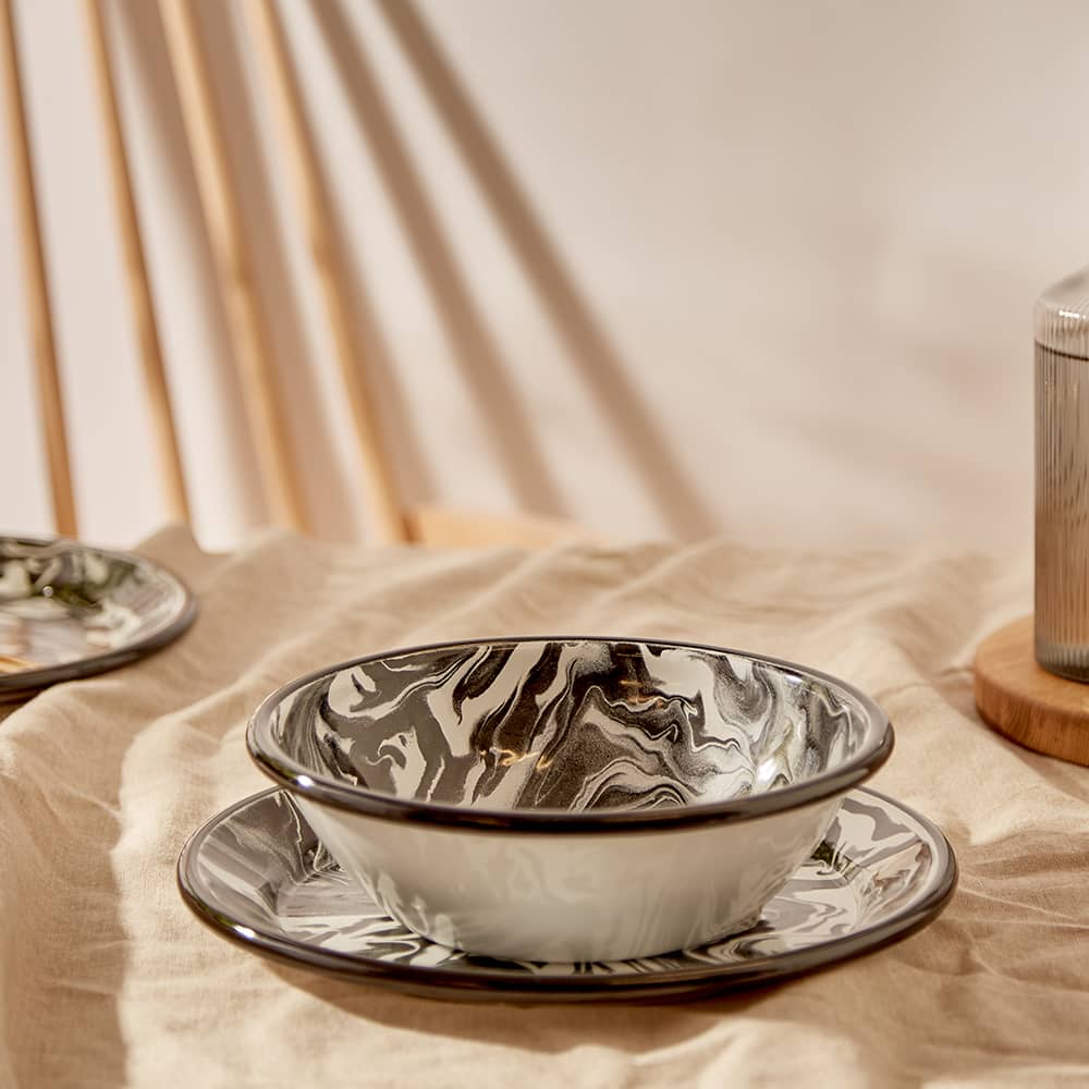 Enamelware is a time honoured and a time consuming process made by fusing glass onto heavy-gauge steel. Raw steel bodies are machine mulled or hand-formed, glazed and then kiln fired to create a smooth surface.