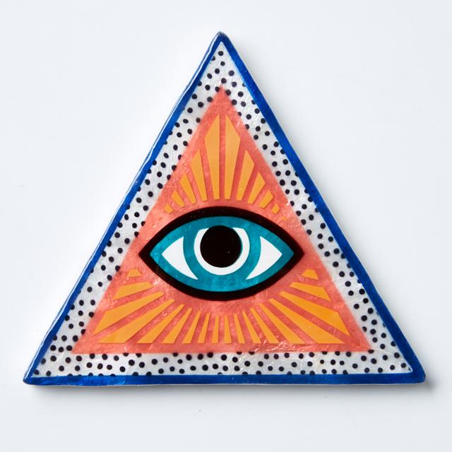 A strong triangular shape complete with polka dots, warm toned orbs and the all seeing eye are celebrated on the Tri Eye wall art by Jones & Co. A